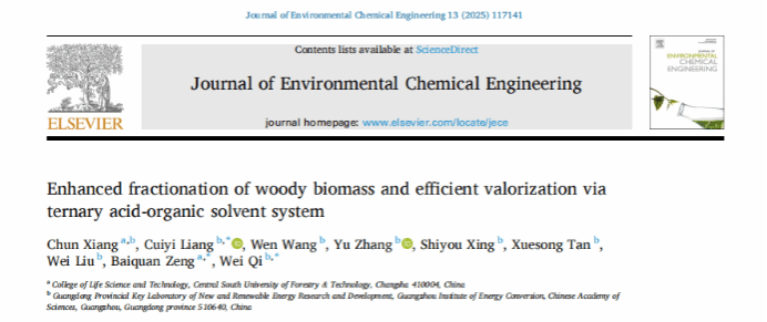 2025年5月,中南林业科技大学曾柏全教授团队在国际高水平学术期刊《Journal of Environmental Chemical Engineering》(Top,IF7.4)发表题为“Enhanced fractionation of woody biomass and efficient valorization via ternary acid-organic solvent system”的研究性论文,中南林业科技大学生物与医药学科2022级硕士研究生向春为第一作者,通讯作者为中南林业科技大学生命科学与技术学院曾柏全教授、中国科学院广州能源研究所亓伟研究员和梁翠谊副研究员,论文第一单位为中南林业科技大学。