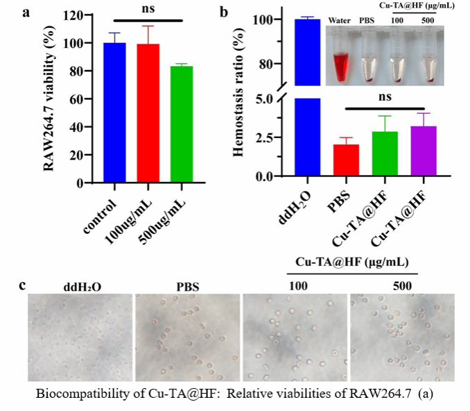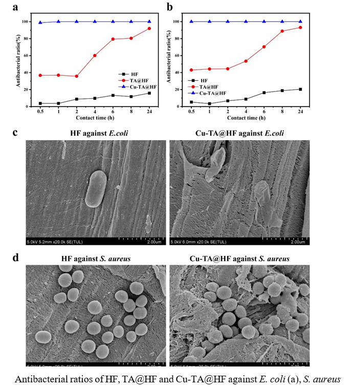 研究结论:新型抗菌纤维Cu-TA@HF性能稳定而且对纤维的机械强度没有显著影响。新型抗菌纤维Cu-TA@HF对金黄色葡萄球菌和大肠杆菌的抗菌率在24小时内超过98%。经过50次洗涤循环,对金黄色葡萄球菌和大肠杆菌的抗菌率仍保持在93%以上,另外该材料具有良好的生物相容性。本研究开创了纺织和医疗领域提升抗菌效果的新途径。