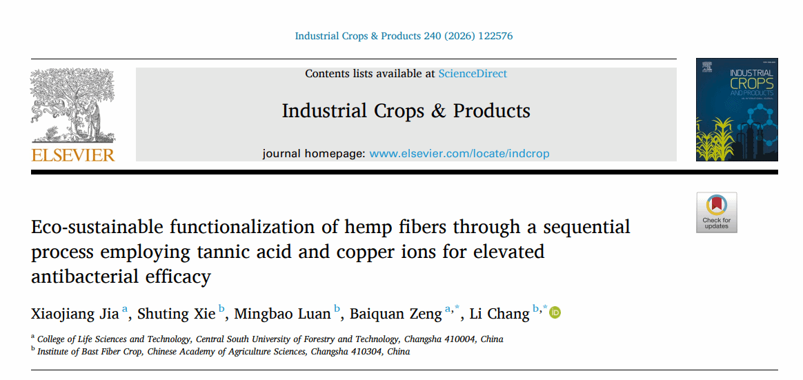 2026年1月,中南林业科技大学曾柏全教授团队在国际知名期刊《Industrial Crops & Prroducts》(中科院1区,Top,IF 6.2)发表题为“Eco-sustainable functionalization of hemp fibers through a sequential process employing tannic acid and copper ions for elevated antibacterial efficacy”的研究性论文,中南林业科技大学2022级博士研究生贾晓江为第一作者,通讯作者为中南林业科技大学生命科学与技术学院曾柏全教授、中国农业科学院麻类研究所常丽博士,论文第一单位为中南林业科技大学。