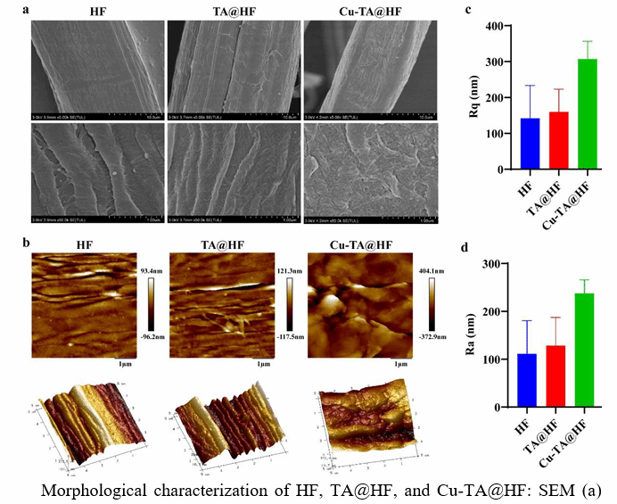 该研究通过一种环保的合成方法,将丹宁酸和铜离子负载到大麻纤维表面,开发了一种新型抗菌纤维Cu-TA@HF,并对新型抗菌纤维Cu-TA@HF开展了全面的稳定性及抗菌效果研究。