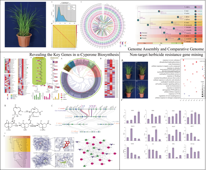 该研究利用PacBio HiFi和Hi-C技术首次构建了香附子端粒到端粒(T2T)高质量基因组图谱,解析了其全基因组复制(WGD)事件和转座子扩增对其入侵性的影响。通过多组学分析鉴定了α-香附酮(α-cyperone)生物合成的关键酶基因(CroTPS11-14)及其调控网络;同时揭示了香附子通过基因家族扩增(如乙酰辅酶A羧化酶ACCase、乙酰乳酸合成酶ALS等靶标基因的拷贝数增加)和代谢抗性机制(涉及CYP450、GST等解毒酶系统)增强除草剂抗性的分子基础。该研究成果为开发新型除草剂、利用合成生物学技术生产α-香附酮(α-cyperone)等提供了重要理论依据,对农业可持续发展和药用资源开发具有重要意义。