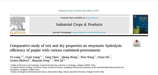 2023年8月,我院曾柏全教授团队在农林科学国际期刊《Industrial Crops & Prroducts》(中科院1区Top,IF 5.9)发表题为“Comparative study of wet and dry properties on enzymatic hydrolysis efficiency of poplar with various combined-pretreatment”的研究性论文,中南林业科技大学硕士研究生龙喻为第一作者,通讯作者为中南林业科技大学生命科学与技术学院曾柏全教授、中国科学院广州能源研究所亓伟研究员和梁翠谊博士,论文第一单位为中南林业科技大学。