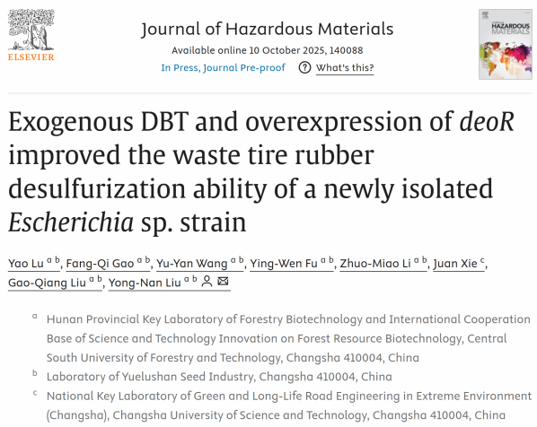 我院微生物生理代谢与绿色发酵团队,以废弃轮胎橡胶为研究材料,从废弃轮胎表面新分离出一株高效脱硫埃希氏菌,发现外源添加二苯并噻吩(DBT)显著提高了埃希氏菌对TR的脱硫能力。进一步通过转录组、基因敲除和过表达等技术发现,过表达转录因子deoR能够有效提高埃希氏菌对TR的脱硫能力。成果以“Exogenous DBT and overexpression of deoR improved the waste tire rubber desulfurization ability of a newly isolated Escherichia sp. strain”为题,发表在国际环境科学领域中科院1区Top期刊《Journal of Hazardous Materials》(IF2024: 11.3)。硕士研究生陆瑶为论文第一作者,刘勇男副教授为通讯作者,团队负责人刘高强教授对该研究提供了指导和支持。