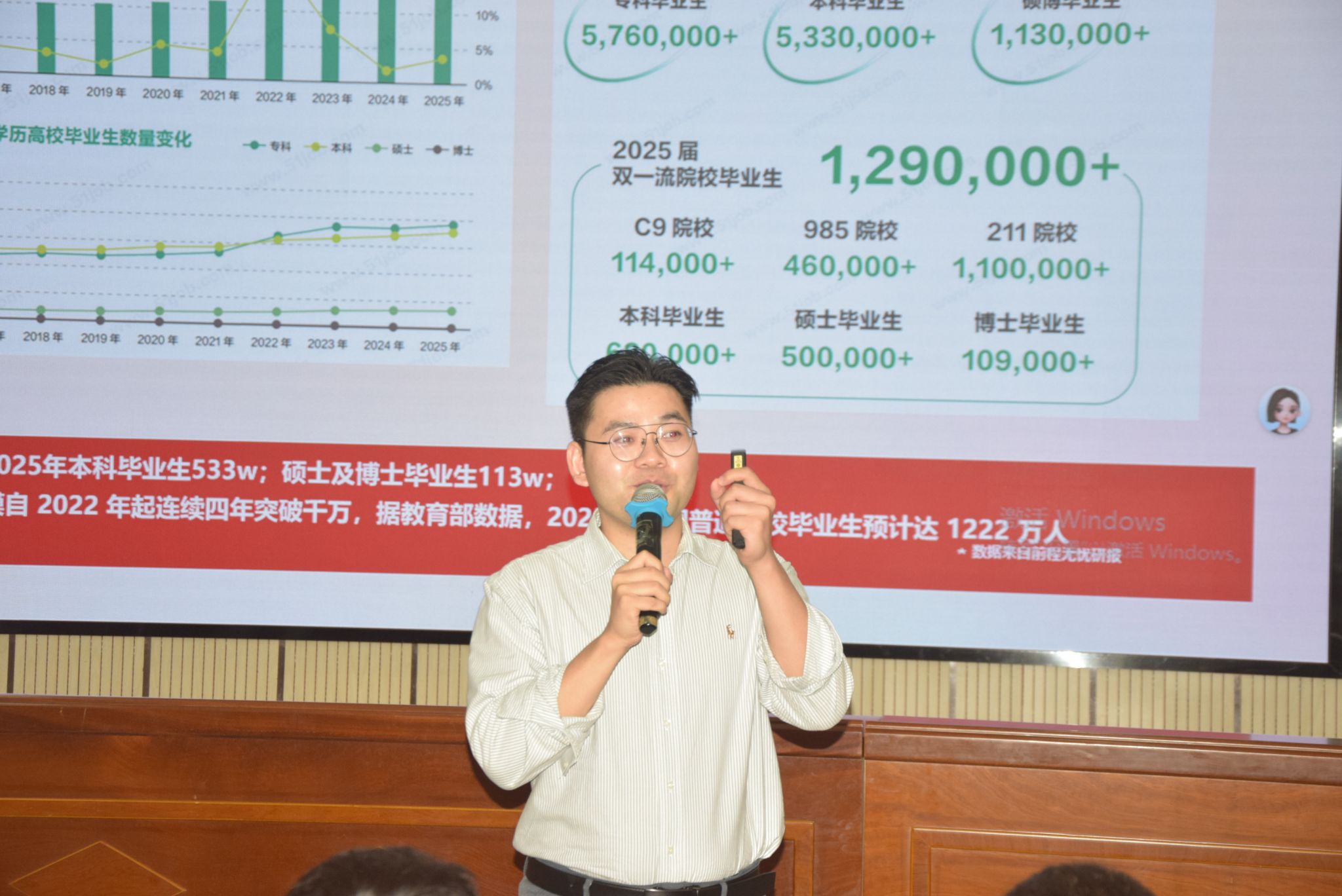 随后,圣湘生物校园招聘经理周鹏鹏进行正式宣讲。他首先通过一组权威数据揭示当前高校毕业生的就业形势:全国每年高校毕业生规模达1100万至1200万人,其中生物大类专业毕业生近30万人。尽管行业整体向好,但“学历高消费”现象日益凸显,研发岗位硕士、博士占比持续攀升,竞争日趋激烈。他以圣湘生物为例,指出公司研发体系近三年已不再招聘本科生,博士与硕士占比合计达62%,凸显行业对高层次人才的迫切需求。