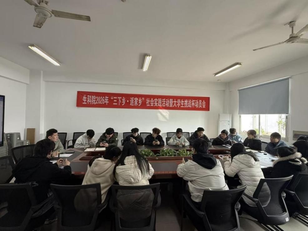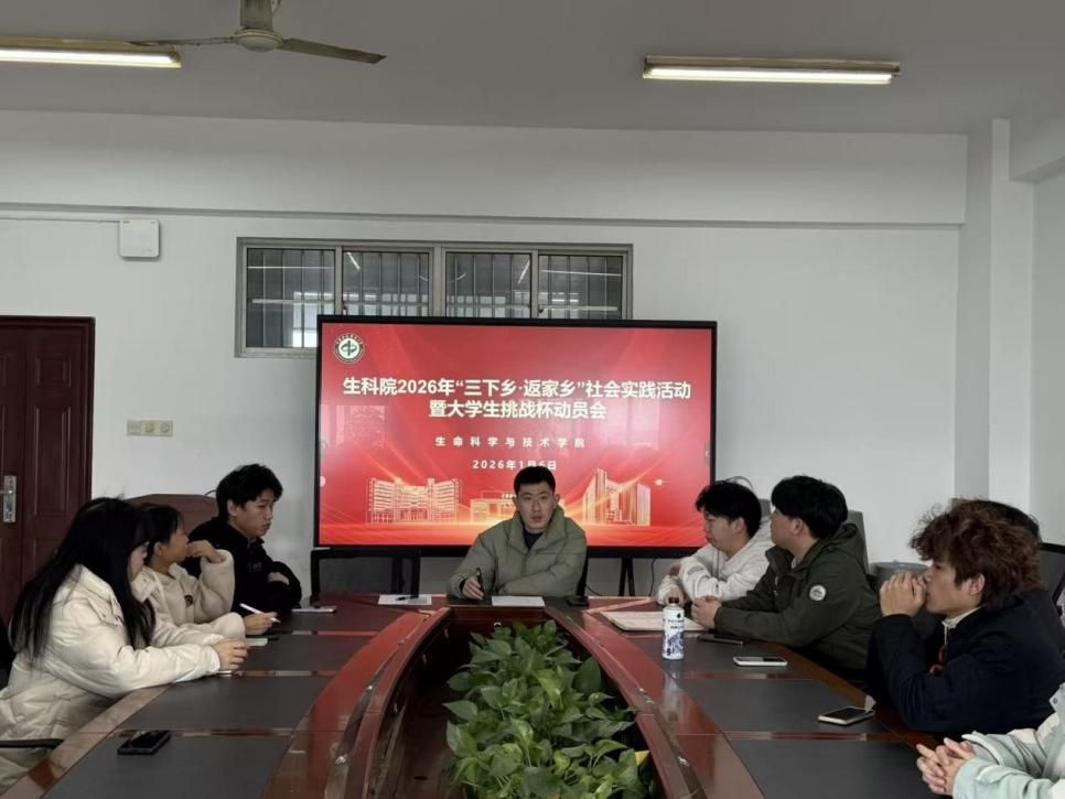 初心如磐,使命在肩;青春聚力,逐梦前行。为引领学子在实践中受教育、长才干、作贡献,在创新中勇突破、敢挑战、攀高峰,生命科学与技术学院于1月6日在求是楼1212会议室召开2026年“三下乡·返家乡”社会实践活动暨大学生挑战杯动员会,学院团委书记、主要学生干部及各年级班长参与会议。