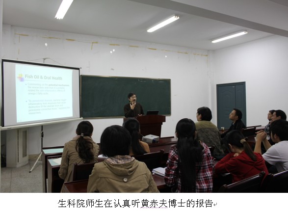 为了循序提高生命科学与技术学院研究生教育学术气氛,应我院副院长王平教授的邀请,10月25日下午15点,美国Kentucky大学口腔健康研究中心高级研究员、美籍华人黄赤夫(Chifu Brad Huang)博士来我院五楼会议室作题为“A‘Fat’Discovery: Omega-3 fatty acids as new anti-microbial agents against oral pathogens——不饱和脂肪酸的抗口腔微生物活性研究”的学术报告。我院生物技术、生物工程等相关专业教师、研究生及部分本科生参加了本次报告会。