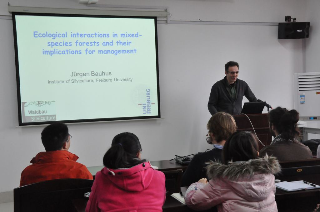 Bauhus教授已为我院培养了2位教师。此次交流期间,Bauhus教授为生命科学与技术院和林学院教师、研究生作了题为“Ecological interaction of mixed-species forests and their implications for forest management”的学术报告,讨论了双方联合培养研究生的意向,对正在南方林业生态应用技术国家工程实验室开展的“Phosphorus availability and cycling in diverse tree species mixtures”合作研究项目实验设计和实施方案进行了交流,目前该项目进展顺利,已有3位德国Freiburg大学的学生和4位我校学生参与该项目的实施。双方合作将在亚热带树种多样性与养分利用关系方面进行深入研究。