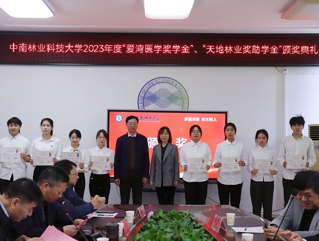 11月28日上午,中南林业科技大学2023年度“爱湾医学奖学金”、“天地林业奖助学金”颁奖典礼在树木楼B座四楼会议室隆重举行。学校副校长朱道弘、校友办主任张仕吉、生命科学与技术学院院长项文化、党委书记李红军、党委副书记贺一骄、食品科学与工程学院党委副书记潘晓杰、深圳爱湾医学检验实验室副总裁王强、广州天地林业有限公司总经理罗丹等企业代表,以及获奖及受助学生出席本次典礼。