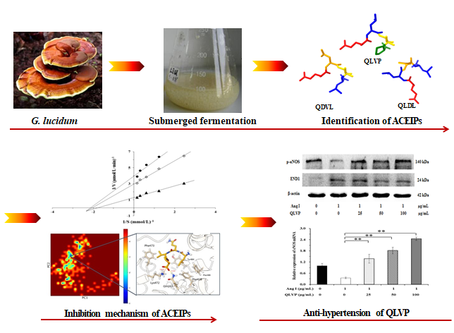 灵芝(Ganoderma lucidum)作为森林名贵药用真菌,是高等真菌基础研究的模式种,在真菌理论科学研究领域具有突出的科学意义。灵芝子实体常用于慢性气管炎、高血压、风湿关节炎及慢性肝炎等慢性疾病的预防和治疗。现有研究表明,灵芝多糖和三萜类化合物是灵芝的关键药效成分,但有关灵芝多肽的研究相对较少。血管紧张素转化酶(ACE)是治疗高血压、心力衰竭、糖尿病合并高血压等疾病的理想靶点。