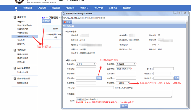 2023年6月1日-2023年6月5日:学生本人填写《生命科学与技术学院转专业申请表》并附书面理由(见附件二),由班主任及所在专业负责人签字通过后填写《中南林业科技大学本科学生转专业申请表》(见附件三)并附相关材料交至生命科学与技术学院学生工作办公室(生命科学楼B427)或提交电子版至623688162@qq.com,学院审核通过后可在教务系统学籍管理模块中提出异动申请。